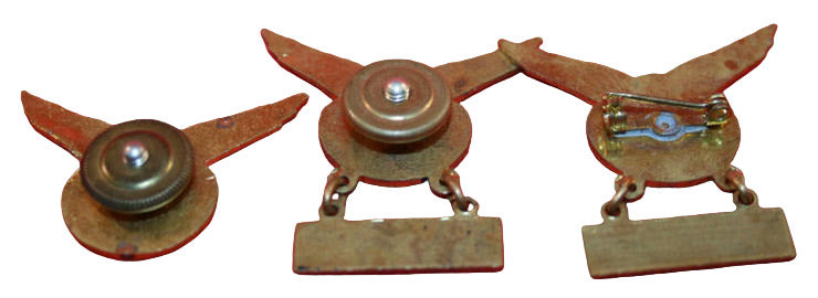 WW2, RCAF Ground Observation Corps, Members pin lot. Lot of 3. One with wings and oval crest, colored painted design, screw post fasteners with nut, B.M. CO. maker marked and one with 3 YEAR bar attached, screw post fastener with nut and one with 5 YEAR bar attached, pin back fastener, last two have no maker marks. All nice.