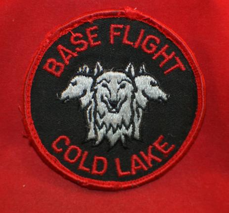 Jacket Crest. BASE FLIGHT, COLD LAKE, words in red with Gray WOLF head design on black, red border, round patch, 3 1/4" across. Dull white thin cloth backing. Older flash and quite nice.