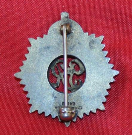Sweetheart pin for the RCASC, Royal Canadian Army Service Corps., marked BIRKS STERLING. Pin Back fastener Red enamel in the Kings Crown, blue enamel backing to the banners. GVIR intials voided centre. Heavy well made pin.