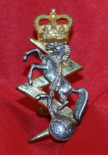 RCEME Collar Badge. OFFICER’S issue. Toned gilt brass with age toned Silver overlay. With lug fasteners. J.R. GAUNT LONDON maker marked.