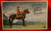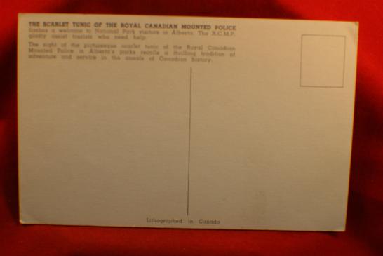 Postcard. Colored, showing red serged member, mounted, with words, "GREETINGS FROM ALBERTA CANADA". No message. Note on back stating members in Alberta National Parks, (Banff & Jasper), on duty to help visitors to the parks. I would say 1950's early 60s. Some slight rounding of corners and age fading but still quite nice.