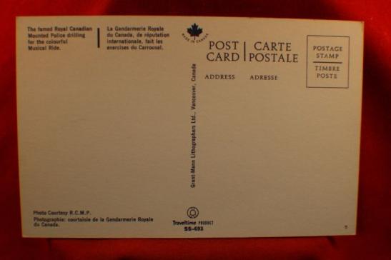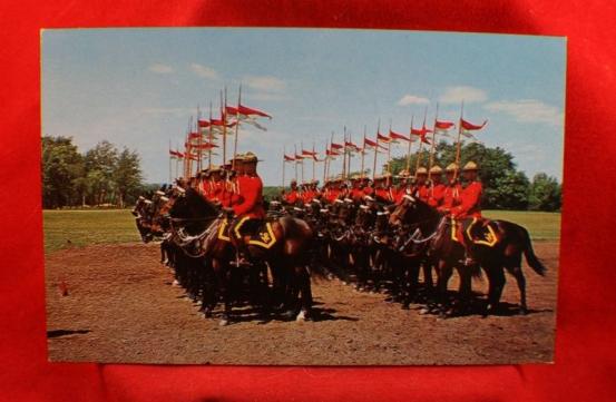 Postcard. Colored, Showing MOUNTED red serge members on parade. No message. On back words, "The Famed RCMP drilling for the colourful Musical Ride". From the uniform details I would say 1960-1970 era. Excellent.