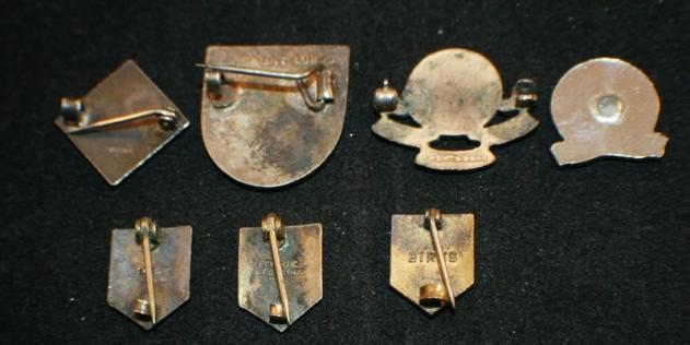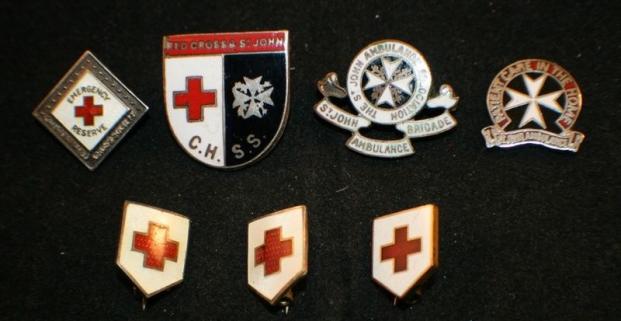 Red Cross & St John Ambulance pin lot. Lot of 7. 1 - Shield shape, 20.37mm wide by 21.57mm high, words on top banner, RED CROSS & ST JOHN, on red enamel over a red Cross on white enamel and letter C.H. and ST John emblem on black enamel and letters S S, maker J.R. GAUNT LONDON, nice. 1 - Sterling, diamond/square shape, words CANADIAN RED CROSS SOCIETY on outside banner and words EMERGENCE RESERVE/13.98mm high/wide, marked STERLING on back. 3 - Shield shapes, red cross on white enamel, pin back, one marked BIRKS and two marked RYRIE/STERLING , on back. 1 - Colored enamel St. John Ambulance crest, with bottom banner, pin back fastener with pin missing, marked KENT & SONS on back, 22.38mm wide by 18.26mm high, small enamel chip on the left side ribbon end. 1 - St Johns Ambulance, PATIENT CARE IN THE HOME pin, screw post fastener missing. Nice lot, mostly Sterling pins.