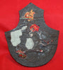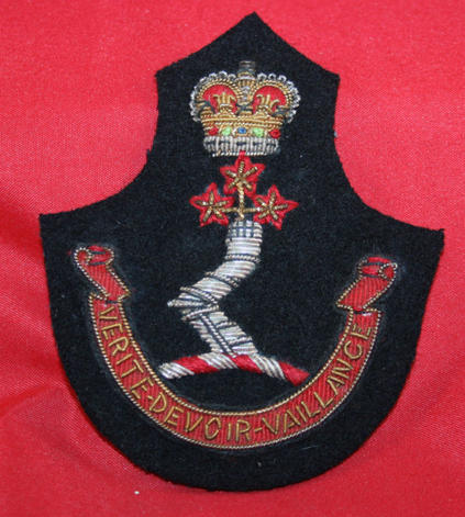 RMC, Royal Military College Blazer Badge- French motto. This is a pocket patch. It is trimmed in gold and silver wire. It has the Queens Crown. New not worn condition. Glue & paper residue on the back. 3 1/2 inches tall by 3 inches wide.