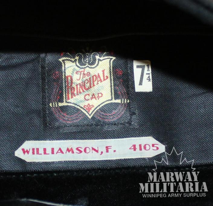 Black melon material cap. With Kings Crown (english) Cap badge, and General service buttons. Very nice tag from principal Cap (size 7 1/4), id tag to Williamson F 4105 inside. Chin strap present. In very good condition.