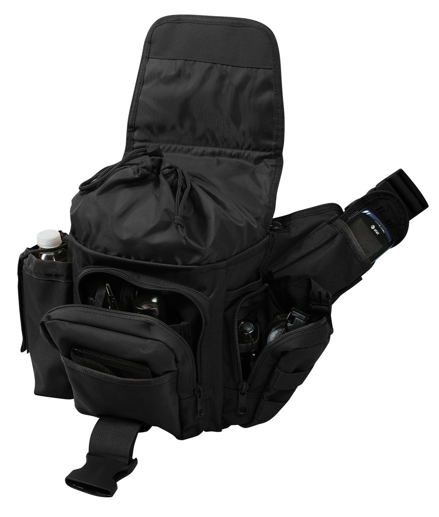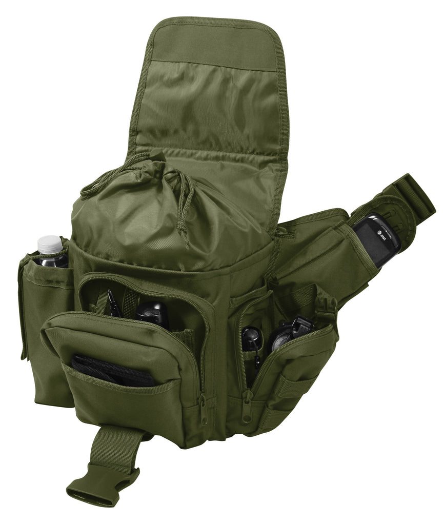 Rothco's Advanced Tactical Bag is made of durable denier polyester and has multiple versatile pouches for maximum storage making it an ideal every day Carry (EDC) bag. This MOLLE compatible tactical shoulder bag features a small zippered side pouch, large side pouch with drawstring closure, two exterior zippered pockets, two inside pockets in the main compartment, and an exterior cell phone pouch. Front flap closure with quick release buckle is designed to keep the contents of the survival bag secure. A 2” wide adjustable padded shoulder strap with a quick release buckle and a three padded back area are included on the tactical bag for added comfort.