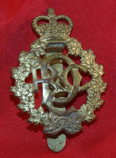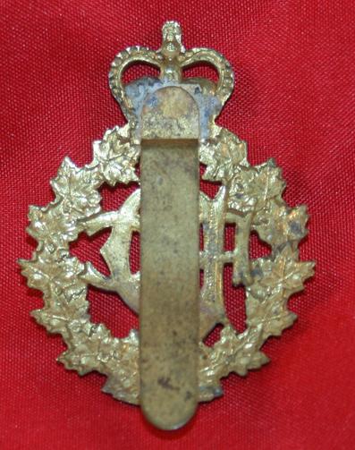THE ROYAL CANADIAN DENTAL CORPS Cap Badge. Brass, with Queens Crown. With a slider fastener. Some tarnishing to the brass.