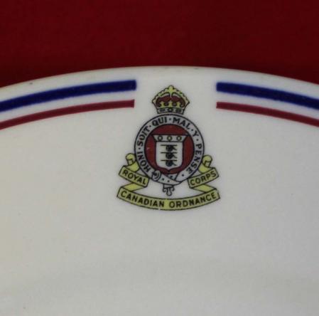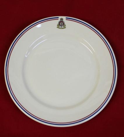 Off white with black, red and yellow regimental crest, with blue and red border. Maker stamped Syracuse China.Shows use, but has no cracks, chips or crazing. 8" wide.