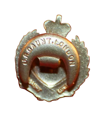 Royal Engineers Association Sweetheart Pin. Brass metal with blue and red enamel. Button hole fastener. 23mm tall. Each piece JR GAUNT LONDON marked.