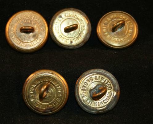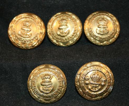 ROYAL MARINE LIGHT INFANTRY Uniform Button Lot of 5 Lot of 5. 4 - Brass metal, 22mm, two - Victorian Crown, SMITH & WRIGHT maker and two - Kings Crown, one SMITH & WRIGHT maker marked and BUTTONS LIMITED. 1 - Gold Gilt, Kings Crown, raised detail, 23mm, JONES maker marked.