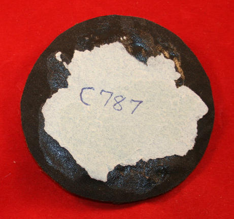 S.W.A. Territory Force Regimental Sergeant Arm Badge ( Embroidered Silver & Black Cotton on Green). Glue and paper on the back. Reference number C787 written in ink on paper.