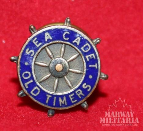 A first for me! Pewter metal with blue enamels. Screw post fastener. Words " SEA CADET OLD TIMER" in blue enamel on ships wheel. 15mm wide.