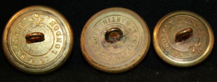 SHROPSHIRE MILITIA Uniform Button Lot. Lot of 3. RIPLEY 485 type. All Victorian Crown. 1 - 25mm size, dull gold plated, Officer's, JENNENS maker marked, excellent well made. 1 - 25mm size, brass metal, PITT maker marked, nice detail. 1 - 22mm size, dull brass metal, JENNENS maker marked. Al well made excellent buttons.