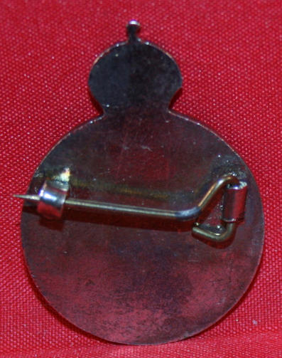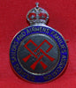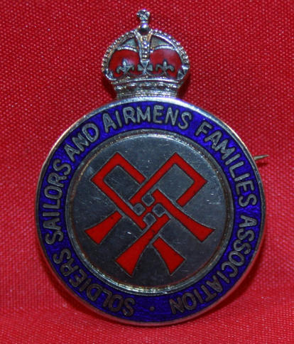 Silver metal, Kings Crown with red enamel in it over circle outer border with words, SOLDIERS SAILORS AND AIRMENS FAMILIES ASSOCIATION, on blue enamel with red enamel A A, intertwined in centre. Pin back. 35mm high by 25mm wide. Nice pin.