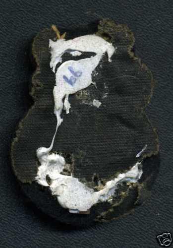 South African Navy, Leading Seaman Cap Badge, worn 1959-1961. A few moth nibbles in the cloth of this badge, backing is coming loose from badge. Paper & glue residue on the back. Colin Owen reference C66.