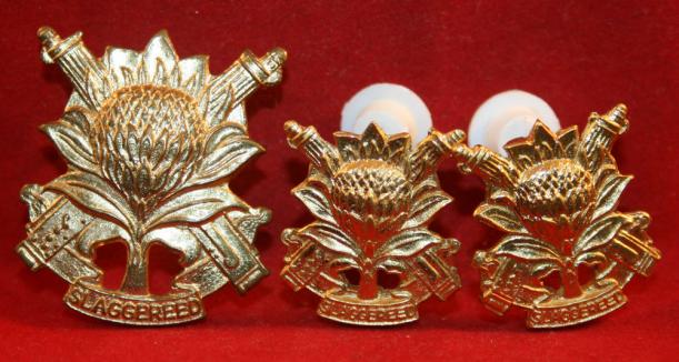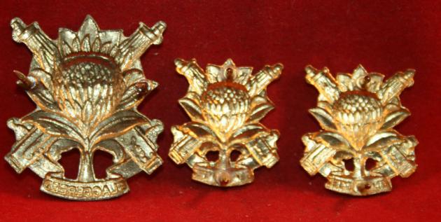 South African Collar badge lot of 3. Regiment Langenhoven. Gold plated.Clutch pin fasteners. OWENS 1183 large single & 1185 & 1186, Officer's Mess Dress. Nice.