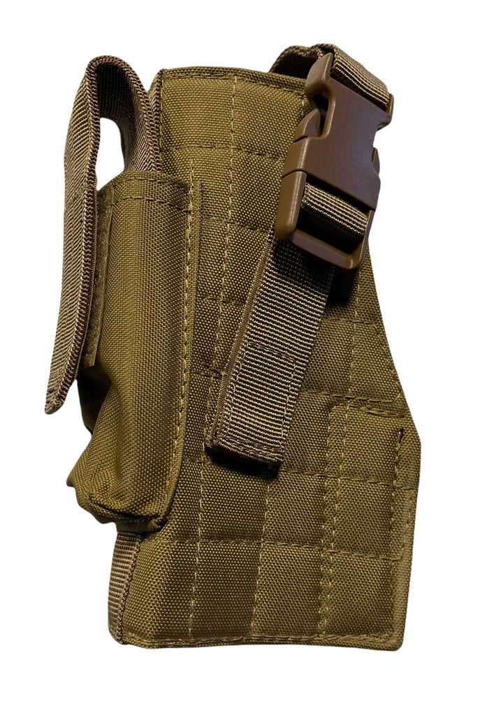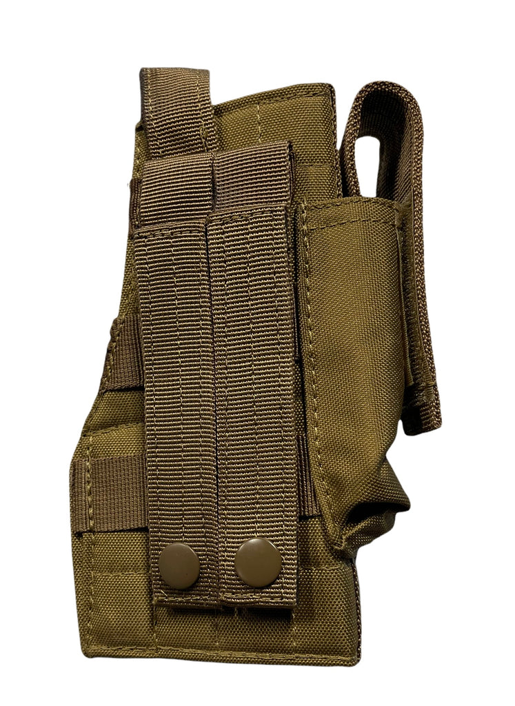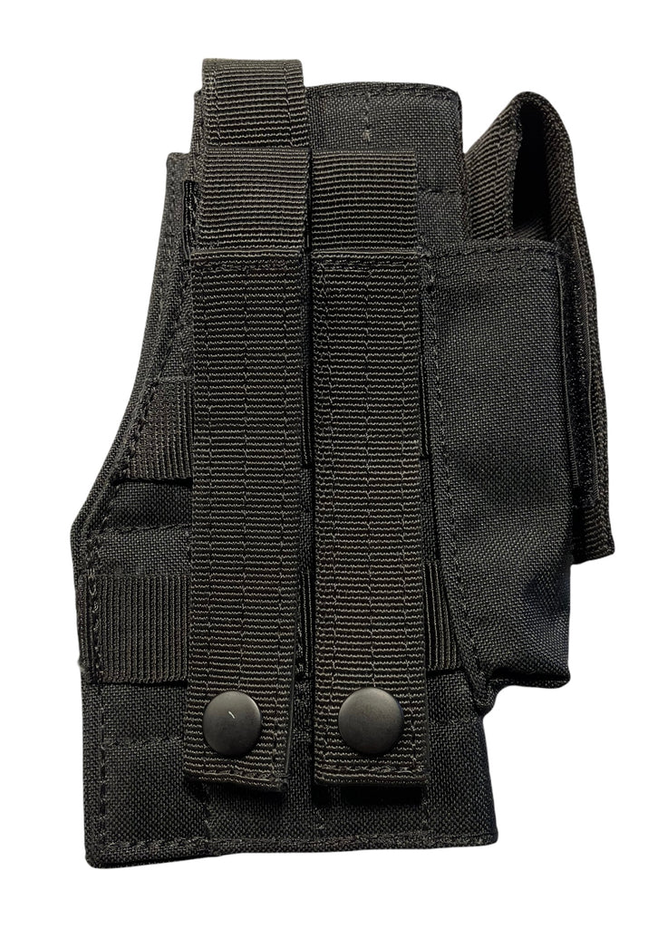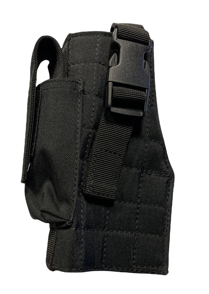 Two MOLLE straps on back attach to any PALS system. Fits pistols sized from .380 to .45. Lightweight construction. Your weapon is secured with a side release buckle system. Left Hand
