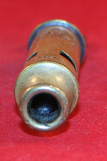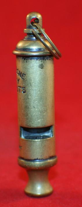 Brass metal. Stamped on tube, THE ACME, curved up/BOY/SCOUTS and the word PATENT. Shows age darkening but nice old whistle. Tube type whistle, 3 3/4" long counting ring, approx. 5/8" wide.