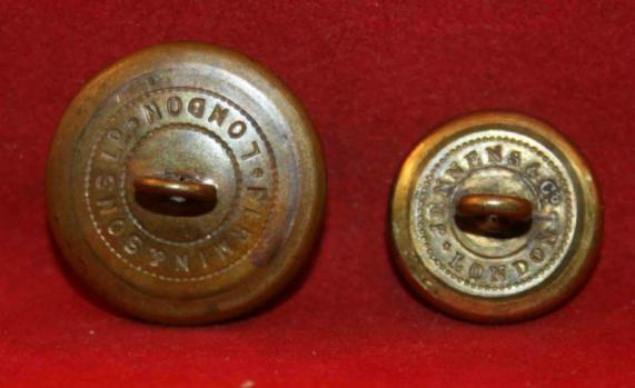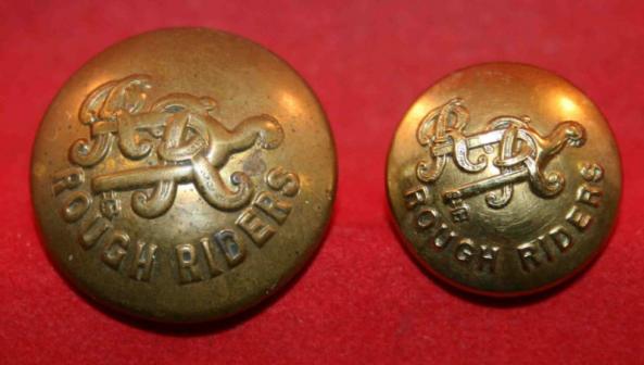 Both have word ROUGH RIDERS on them, 1 - 25.17mm, dull gold coated, maker FIRMIN & SONS LTD LONDON . 1 - 19.24mm, bright brass metal, maker J.R. GAUNT & SON LONDON. Nice stampings. Lot of 2. Ripley 371.