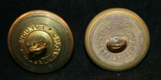 THE DEVONSHIRE REGIMENT Uniform Button Lot. Lot of 2. RIPLEY 221. Both. 25mm size. Both dull gold coated. Both Kings Crown, slight different design. GAUNT and STILLWELL maker marked.