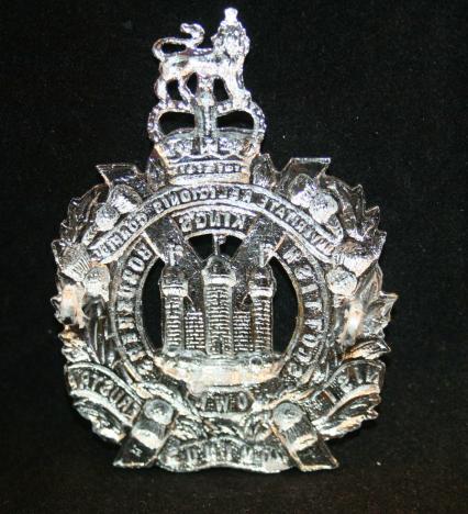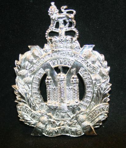 THE KING'S OWN SCOTTISH BORDERERS Cap Badge. Silver plated Anodized Plastic, Queens Crown, lug fasteners, nice stamping. KK1988.