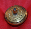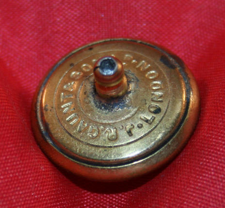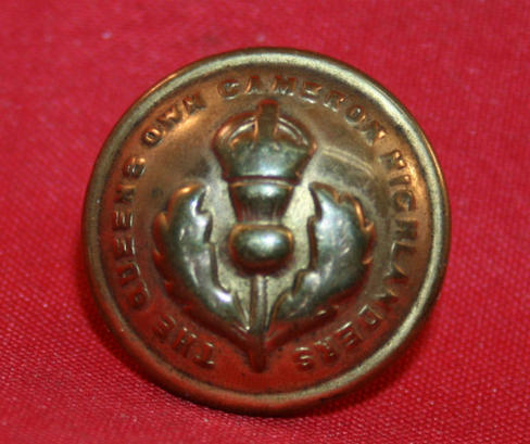 Gold plate button, 19mm size. Raised smooth border and Kings Crown over Thistle with words THE QUEENS OWN CAMERON HIGHLANDERS around outter edge. Shows wear to high points. Loop at back replaced with pin holder for attaching long hat pin. Maker, J.R. GAUNT & SONS Ld. LONDON.