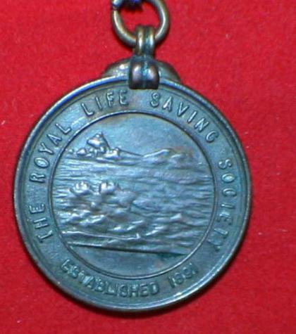 THE ROYAL LIFE SAVING SOCIETY Medal. Bronze, with top loop and short linked chain, 16" long. On one side words, THE ROYAL LIFE SAVING SOCIETY ESTABLISHED 1891 and a Water/Shore scene, showing heavy wear to high points and on the other side, words, QUEMCUNQUE MISERUM VIDEIS HOMINEM SCIAS * AWARDED TO, C. BEVAN SEP. 1911, engraved. Bears some research.