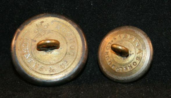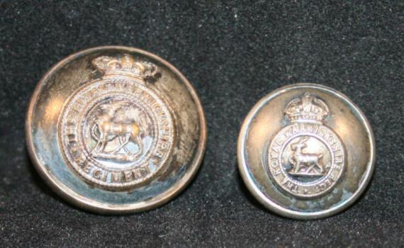 THE ROYAL WARWICKSHIRE REGIMENT Uniform Button Lot. Lot of 2. RIPLEY 210 & 211. 1 - 25mm size, Victorian Crown, bronze base metal showing through darkened silver, excellent detail, JENNENS maker marked. 1 - 19mm, Kings Crown, silver metal, FIRMIN. maker mark.