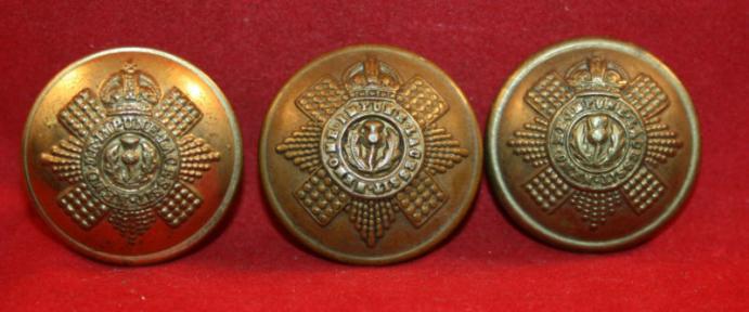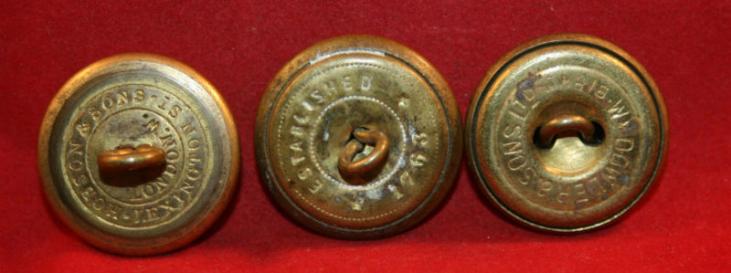 Lot of 3. Ripley 82 type. All, Kings Crown over Cross Design with Rays between arms and Latin motto on banner with Thistle center, raised smooth edge with smooth backing to design. 1 - dark bronze metal, 25.83mm size, maker ESTABLISHED 1763. 1 - dull brass, 25.26mm, WM DOWLER & SONS LTD, BIRM.. 1 - dull gold coated, 25.04mm, maker HOBSON & SONS LEXINGTON ST, nice quality button. All excellent.