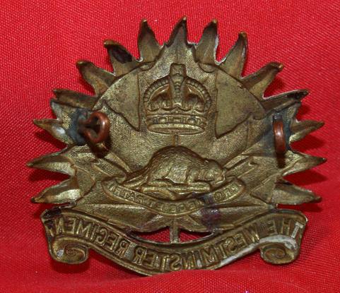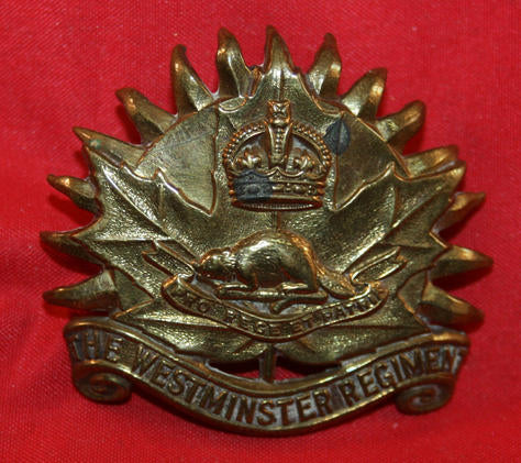 The Westminster Regiment Cap Badge. Brass, with lug fasteners on the reverse.Sun rays have been folded back, interesting variation. Two spots of discoloration to front.