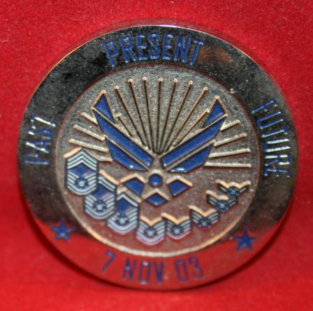 Tinker AFB Enlistment Heritage Celebration, Challenge Coin. Chromed metal, with red, white and yellow paint. Past, Present Future. 7 Nov 03. Gently worn condition.