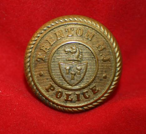 Trenton NJ Police Uniform Button - Old Obsolete style / design.Beginning to show age toning to gilt brass metal. Loop on the back. 25mm wide. Maker stamped S.A FRENCH NEW YORK.
