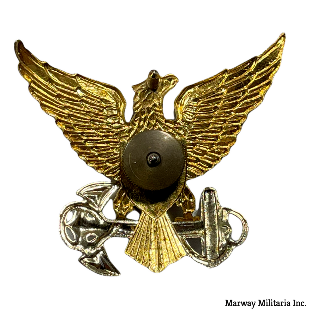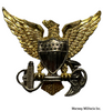 Bi metal, with screw post fastener. Very well made. Wingspan is 2 3/4" wide x 2 1/8" tall from head to tail feather.