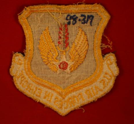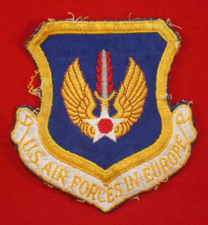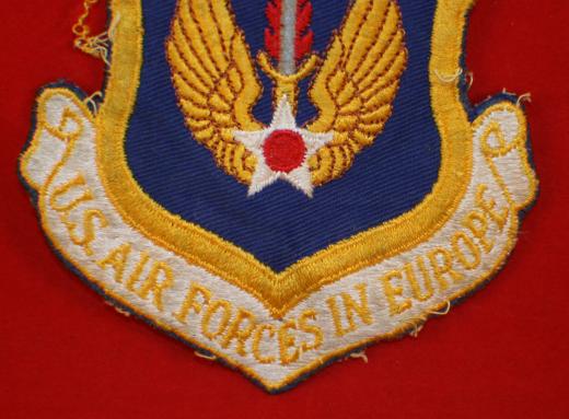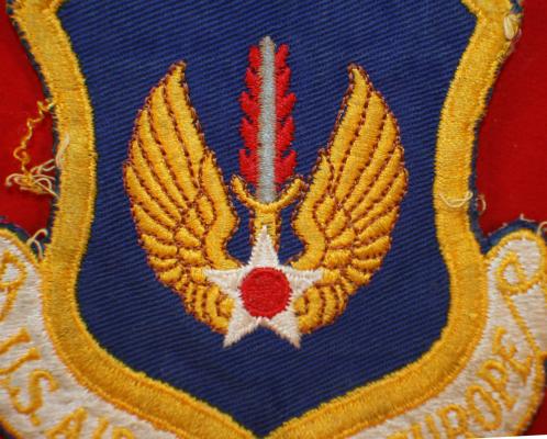 USA, 8th Air Force, Air Forces in Europe, Jacket Crest. Formed in 1945. Nice early, 4 3/4" x 4 1/2" wide, colored jacket crest, showing use, age darkening and some thread separation on edges but still quite nice. White gauze type cloth backing. Early issue.