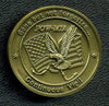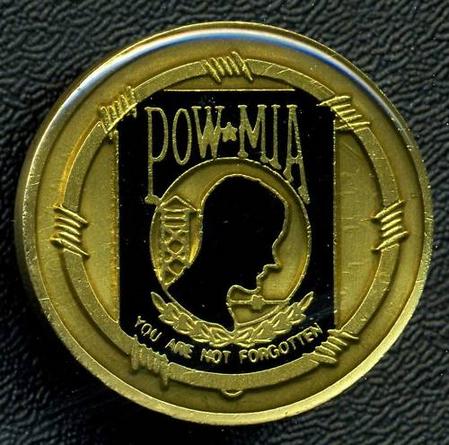 Round medallion, 40mm across. Design on front, under clear plastic cover, words POW MIA YOU ARE NOT FORGOTTEN with a Side profile Head and Guard Tower, gold and black. On other side, dull gold metal, words GONE BUT NOT FORGOTTEN CONTINUOUS VIGIL on outside banner and POW - MIA and American Flag and Flying Eagle design centre. Very well made and excellent condition.