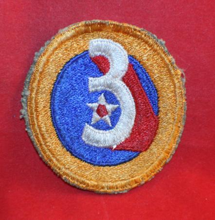 WW2 era, USA 3rd AIR FORCE. Slight oval shape, 2 3/4" x 2 1/2". age dulled cloth thread, white gauze type backing. Shows age dulling and use.