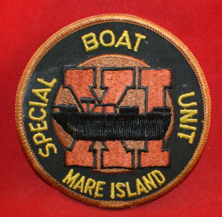 Jacket Crest. USA, round, 3 1/2" across cloth patch. Words, SPECIAL BOAT UNIT, MARE ISLAND, in yellow with X I in dull orange with black Boat, on black with dull gold outer border. Clear plastic backing which has cracked due to age. Older flash and showing some age dulling but still excellent.