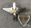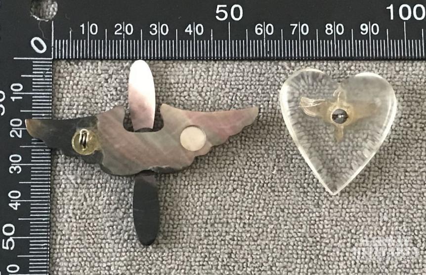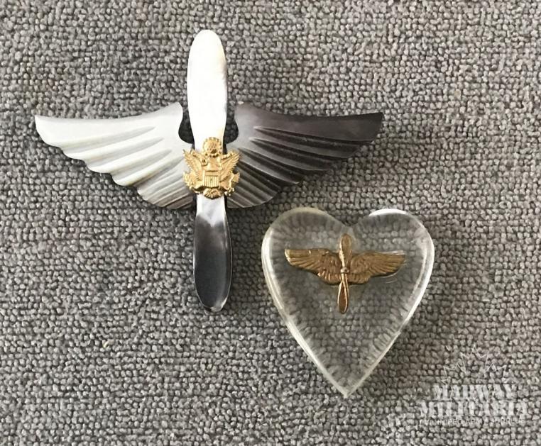 United States Air Force. Both are quite nice. Chain missing from heart, and pin missing from other.
