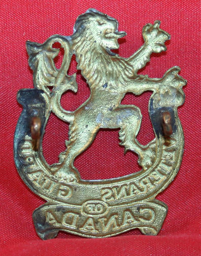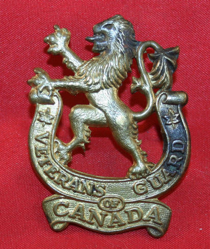 Veterans Guard of Canada Cap Badge. Brass with lug fasteners on the back. Blackening to about 1/4 of it.