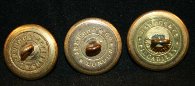 VICTORIAN COURT BUTTONS Uniform Button Lot. Lot of 3. All Gold Plated or dull Gilt. All Victorian Crown by itself. 1 - 21mm, 2 piece, with the Crown overlay, JENNENS maker. 2 - dull gilt, 22mm, JENNENS make and 23mm, HAWKES make, Crown on fine lined backing, smooth outer border.