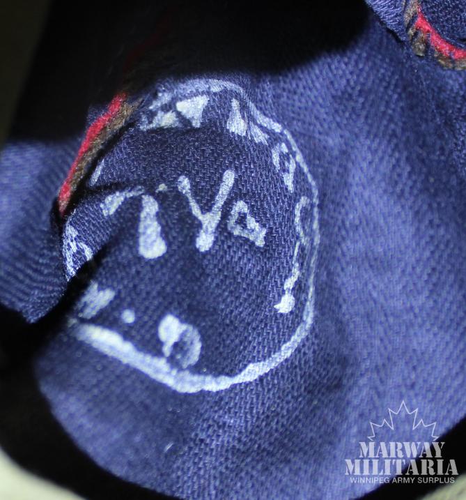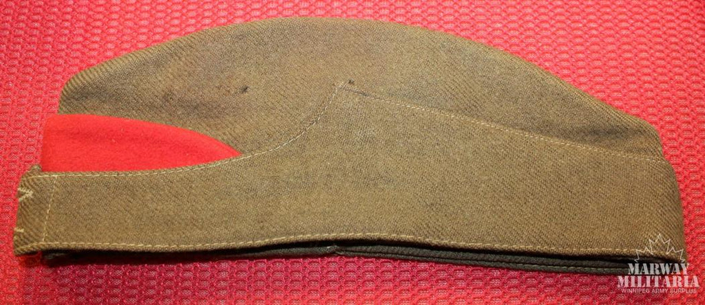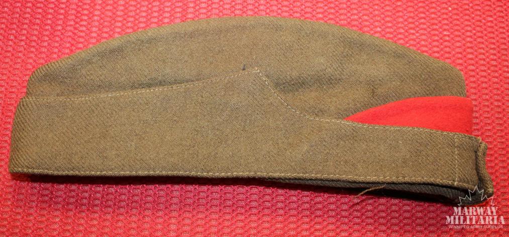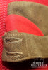 Wedge Hat. Dark brown material, with a red front wedge and red top fold. No front buttons, had a large round badge imprint with two lug holes present. Stamp on the inside, hard to make but looks like, HAR??A (could be National) HAT MFG CO. and 7 ¼. Shows some age dulling but still quite nice.
