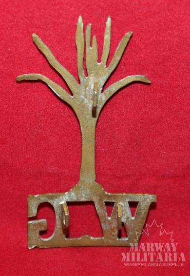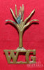 Brass metal, Leek with W G under it, three 5 sided British style lugs on back, 66.96mm high x 36.27mm wide. Dark green spot of the leek leafs.