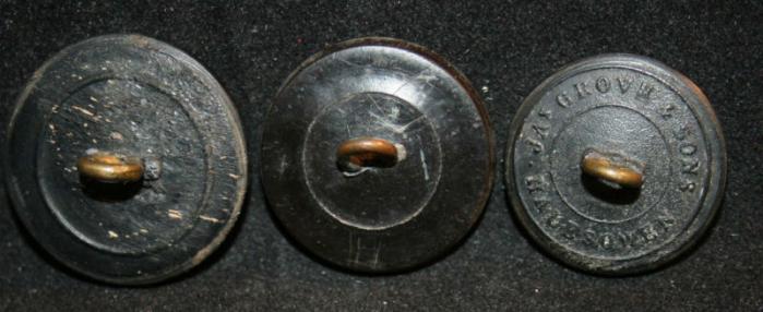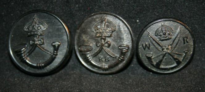 Bakelite (Horn) lot. Uniform Button. Lot of 3. 1 - RIPLEY 566. 25mm, RIFLE BRIGADE, Kings Crown over Horn with letters RB. 1 - 21mm, Kings Crown with Crossed Rifles, Horn and letters W R. 1 - 25mm, Kings Crown over Horn. WITWATERSRAND RIFLES [S AFRICA].