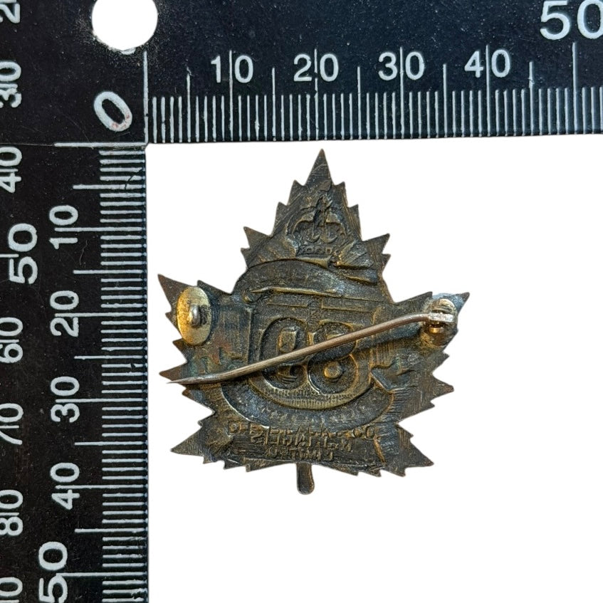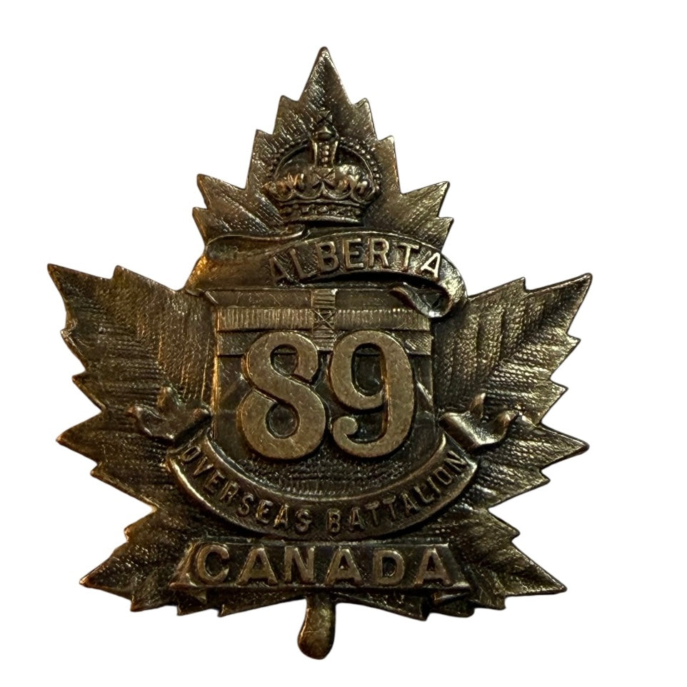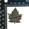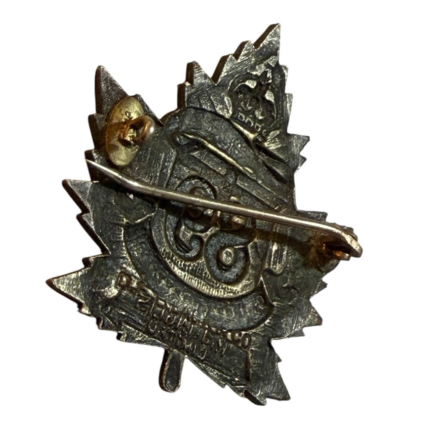 Calgary. Antiqued brass metal, pin fastener replacing lugs. Maker stamped.