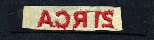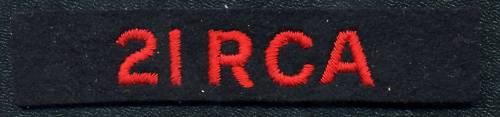 WW2, 21 RCA (Royal Canadian Artillery) Cloth Shoulder Title. Red on Dark blue, white gauze backing. A few small pin holes, maybe from a staple?