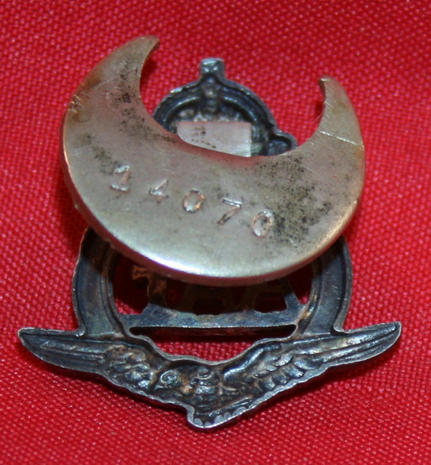 British "Auxiliary Air Force" members Veteran pin. Silver metal, Kings Crown over circle banner with letters, voided, A A F in centre over Flying Eagle bottom design. Button hole fasteners numbered 14070. 25mm high by 22mm wide. Nice pin.