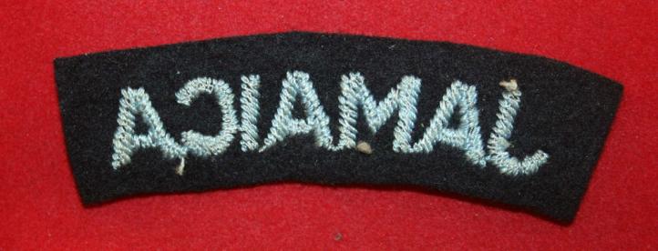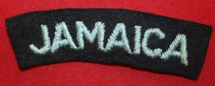 WW2 Nationality Shoulder Patch Insignia. JAMAICA, curved up very slightly, light blue, thick stitching on black, no cloth backing. 11mm high letters. I believe this to be authentic, WW2 period. It does not glow using a black light. Appears not worn. Worn by airmen from this country while training with the British Commonwealth Air Training Plan during WW2.