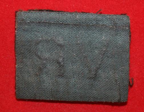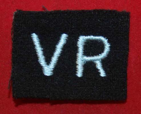 WW2, Canadian/British VR, Volunteer Reserve, cloth flash. Letters V R, light blue thread on black felt, black paper type cloth backing. Letters, 15mm high letters.