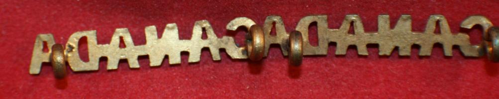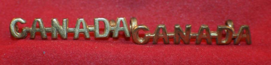 WW2, Canadian, NURSING SISTERS, CANADA shoulder badge pair. Dull gold letters, CANADA, 6.10mm high, letters cut out, joined in centre. Lug fasteners. The Nursing Sisters wore these titles. Nice some age dulling.