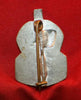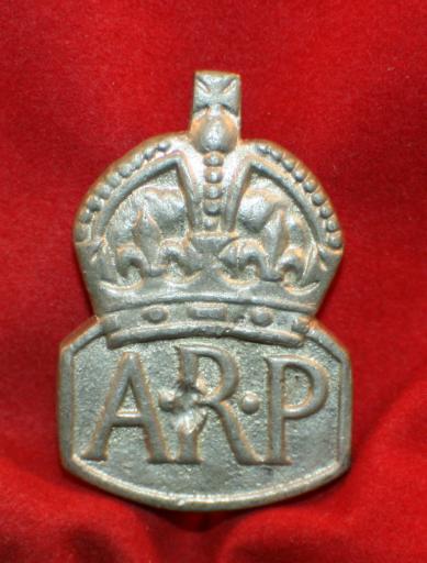 WW2 era, A.R.P., Air Raid Protection, members pin. Gray coated white metal, 38.47mm high by 25.88mm wide, with pin back fastener. There is a small egg shaped dent near the letter R, left side, about half way down, otherwise excellent. Quite heavy, much heavier than often found.